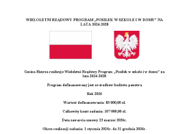2026-03-24 WIELOLETNI RZĄDOWY PROGRAM „POSIŁEK W SZKOLE I W DOMU” NA LATA 2024-2028 Gmina Biszcza realizuje Wieloletni Rządowy Program „Posiłek w szkole i w domu” na lata 2024-2028 Program dofinansowany jest ze środków budżetu państwa Rok 2026. Wartość dofinansowania: 83 000,00 zł. Całkowity koszt zadania: 107 000,00 zł. Data zawarcia umowy 23 marca 2026r. Okres realizacji zadania: 1 stycznia 2026 r. do 31 grudnia 2026r.