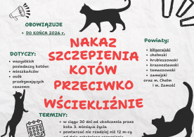 2026-01-08 Obowiązek szczepienia kotów przeciwko wściekliźnie Informujemy, że na podstawie Rozporządzenia Nr 1 Wojewody Lubelskiego wprowadzony został obowiązek szczepienia kotów przeciwko wściekliźnie. Obowiązek ten dotyczy właścicieli kotów z terenu: powiatów: biłgorajskiego, chełmskiego, hrubieszowskiego, krasnostawskiego, tomaszowskiego, zamojskiego, miast na prawach powiatu: Chełm i Zamość. Celem wprowadzenia obowiązku szczepień jest ochrona zdrowia mieszkańców oraz zapobieganie rozprzestrzenianiu się wścieklizny – choroby stanowiącej poważne zagrożenie dla ludzi i zwierząt. Apelujemy do właścicieli kotów o terminowe wykonanie szczepień oraz przestrzeganie obowiązujących przepisów.