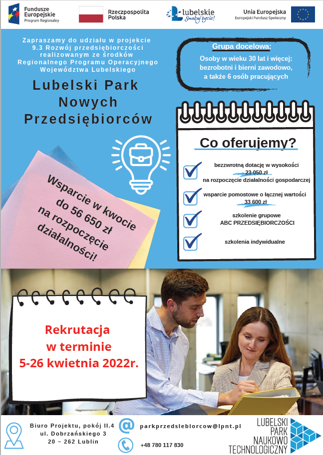 Wszelkie informacje dotyczące projektu, w tym przyjmowania zgłoszeń dostępne są na naszej stronie internetowej www.lpnt.pl. Zainteresowane osoby zachęcamy do kontaktu: tel.: (+48) 780 117 830, e-mail: parkprzedsiebiorcow@lpnt.pl