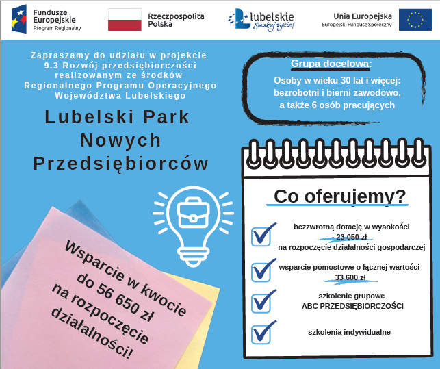 Projekt skierowany jest do osób fizycznych w wieku 30 lat i więcej mieszkających na terenie województwa lubelskiego. Zaplanowane w projekcie kompleksowe wsparcie w zakresie rozpoczynania i prowadzenia działalności gospodarczej skierowane jest do osób bezrobotnych (w tym zarejestrowanych w urzędzie jako bezrobotne), biernych zawodowo, ubogich osób pracujących, osób pracujących na umowach krótkoterminowych lub cywilnych, których wynagrodzenie nie przekracza wysokości 120% minimalnego wynagrodzenia. Ze wsparcia skorzystać mogą imigranci, reemigranci oraz osoby odchodzące z rolnictwa.