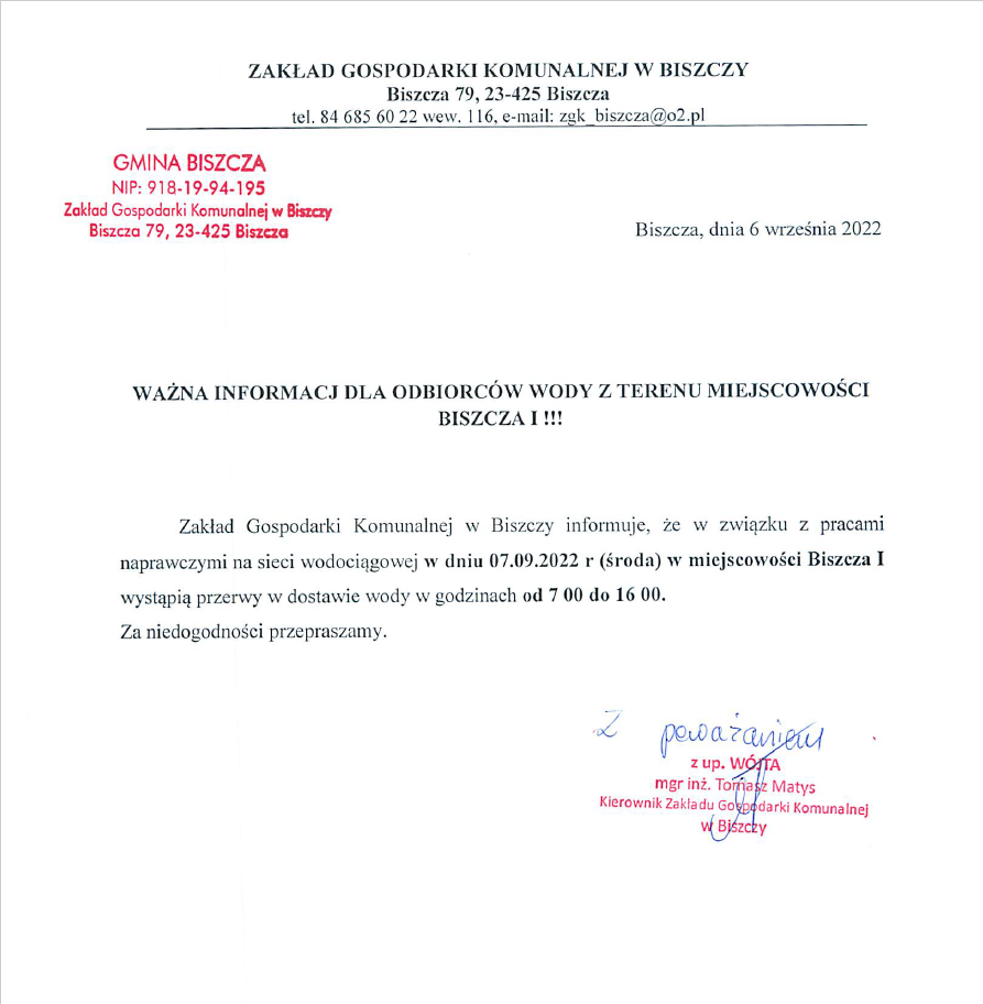 WAŻNA INFORMACJA DLA ODBIORCÓW WODY Z TERENU MIEJSCOWOŚCI BISZCZA I !!!