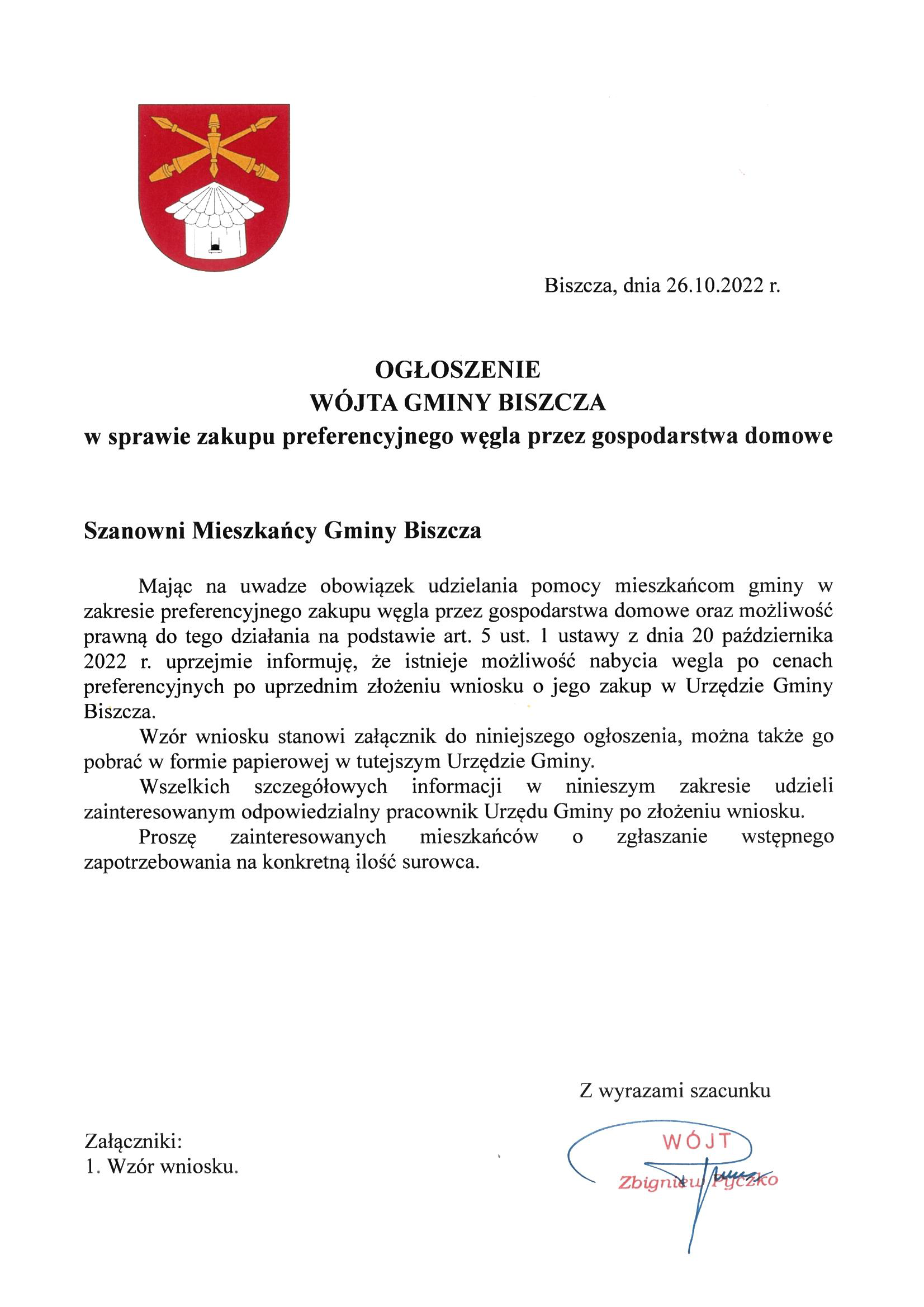 Ogłoszenie Wójta Gminy Biszcza w sprawie zakupu preferencyjnego węgla przez gospodarstwa domowe 2022-10-26 Do pobrania: wniosek w sprawie zakupu preferencyjnego węgla przez gospodarstwa domowe « powrót