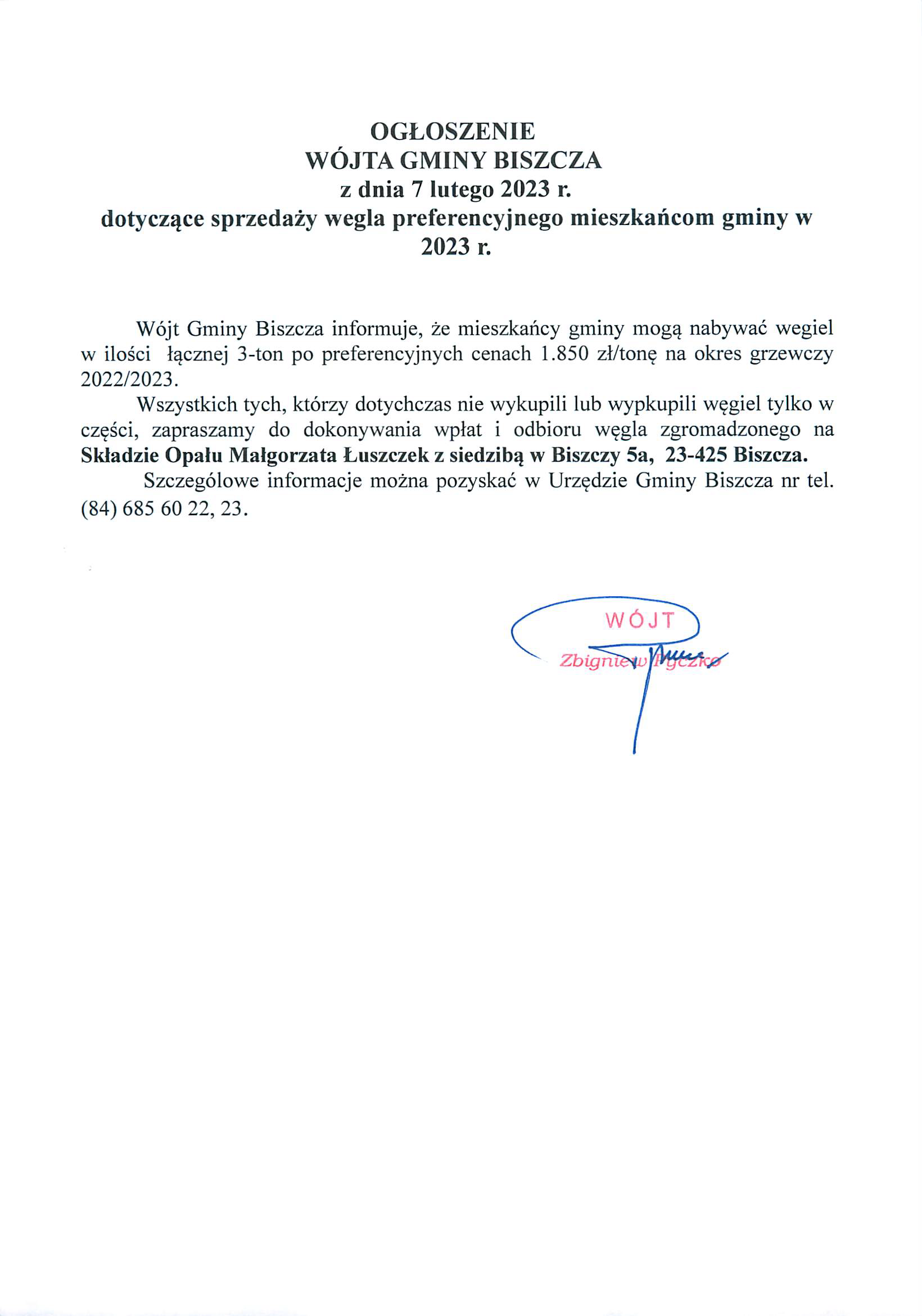 OGŁOSZENIE WÓJTA GMINY BISZCZA