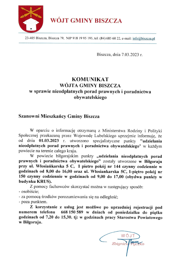 KOMUNIKAT WÓJTA GMINY BISZCZA w sprawie nieodpłatnych porad prawnych i poradnictwa obywatelskiego 2023-03-06 Do pobrania: Komunikat Wójta Gminy Biszcza « powrót