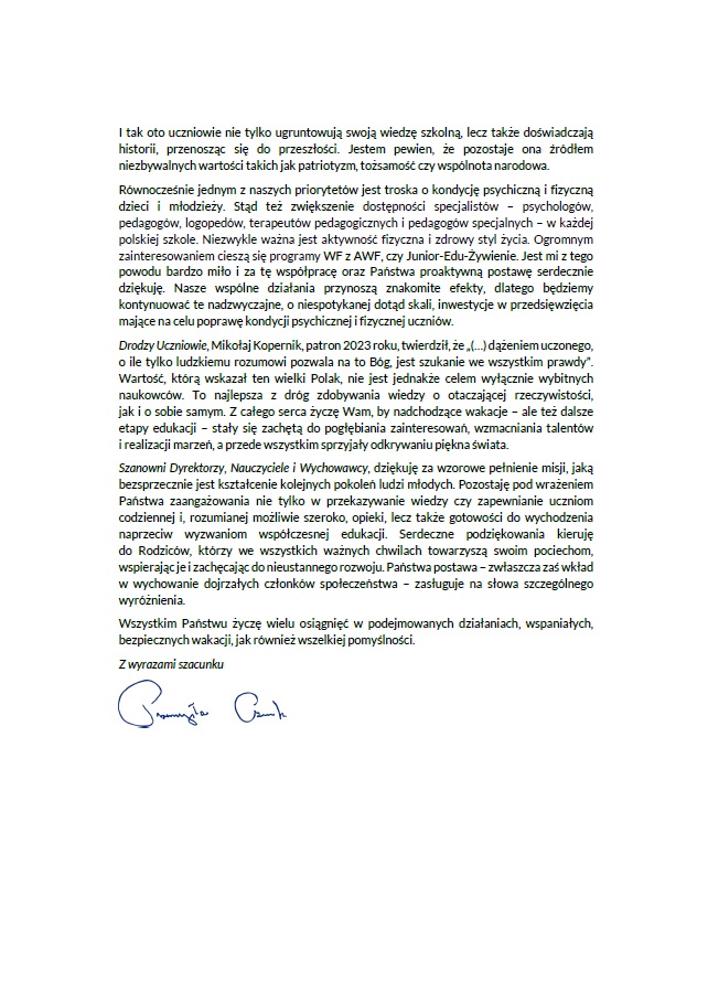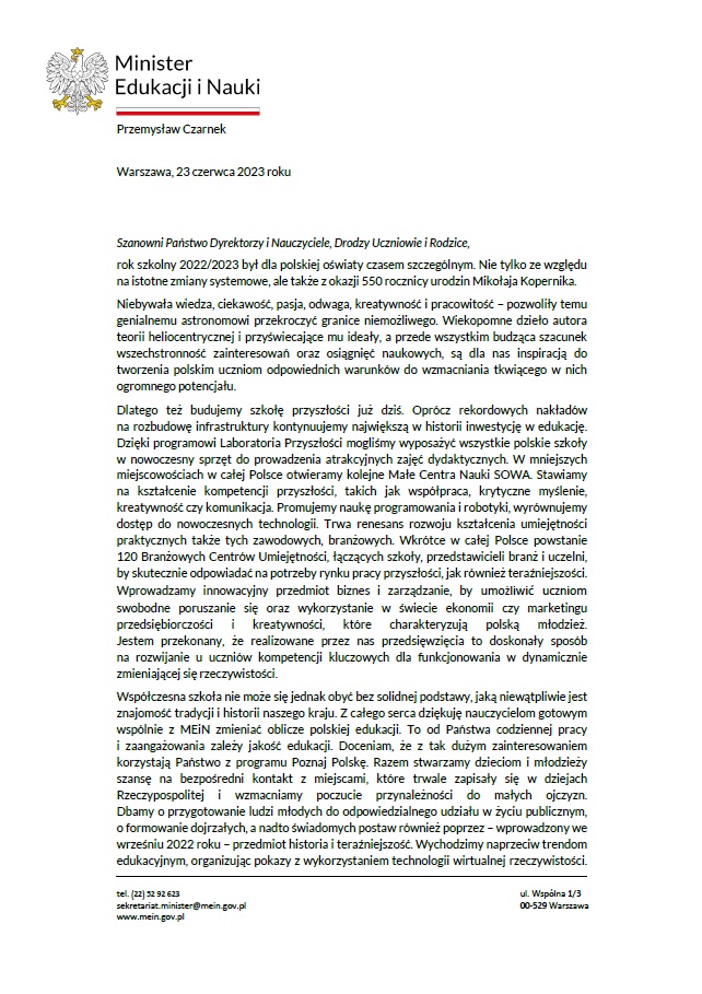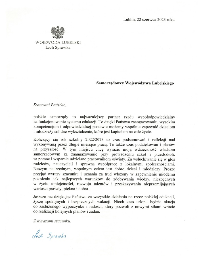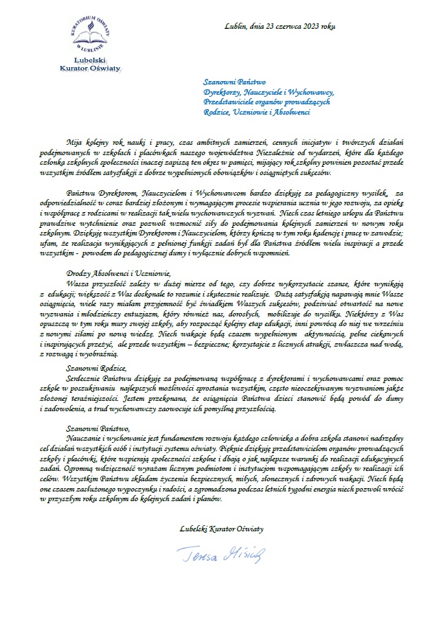 Zakończenie roku szkolnego 2022/2023 2023-06-23 Do pobrania: List Wojewody Lubelskiego Lecha Sprawki, List Lubelskiego Kuratora Oświaty Teresy Misiuk List Ministra Edukacji i Nauki Przemysława Czarnka « powrót