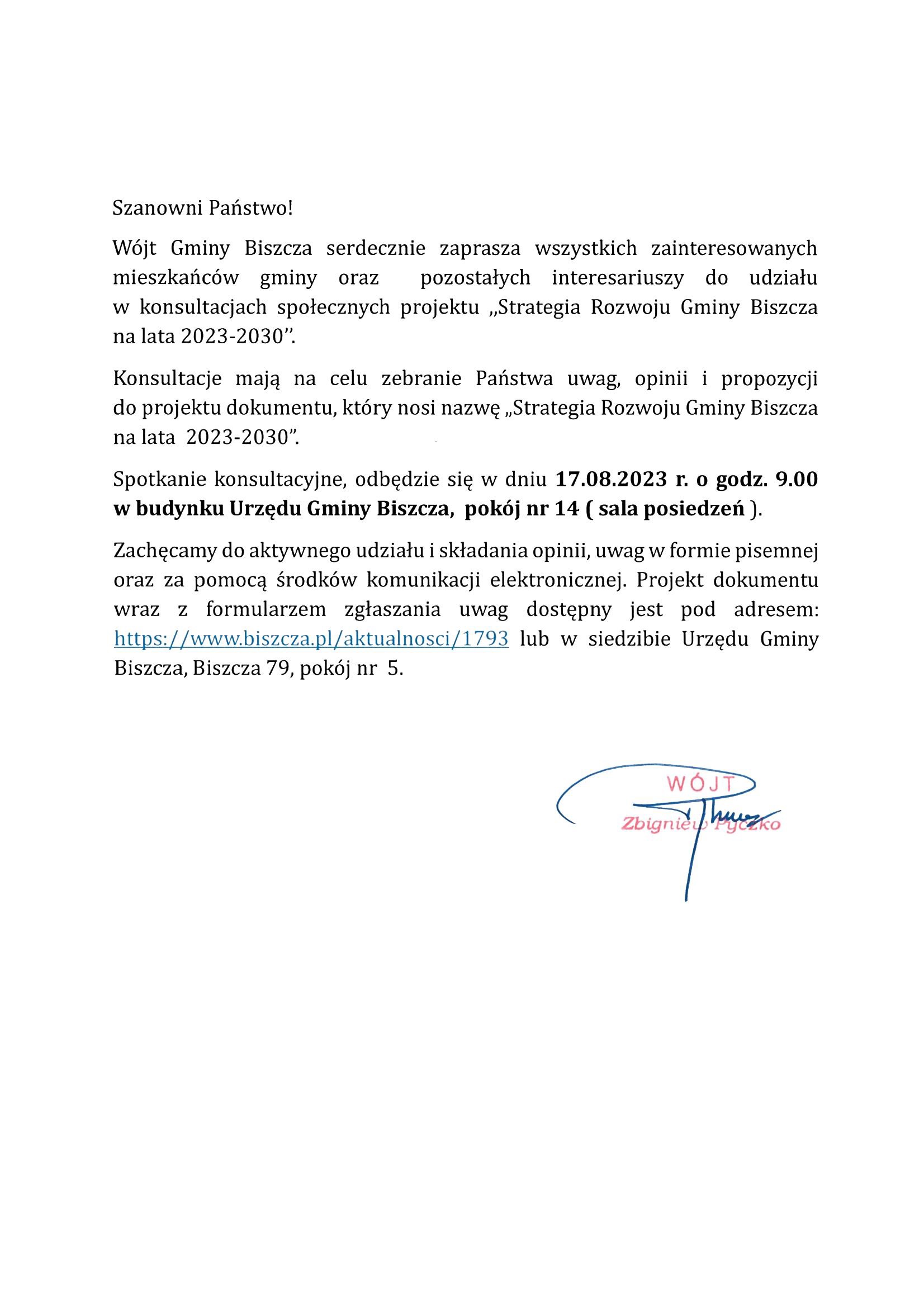 Spotkanie konsultacyjne, odbędzie się w dniu 17.08.2023 r. o godz. 9.00 w budynku Urzędu Gminy Biszcza, pokój nr 14 ( sala posiedzeń ).