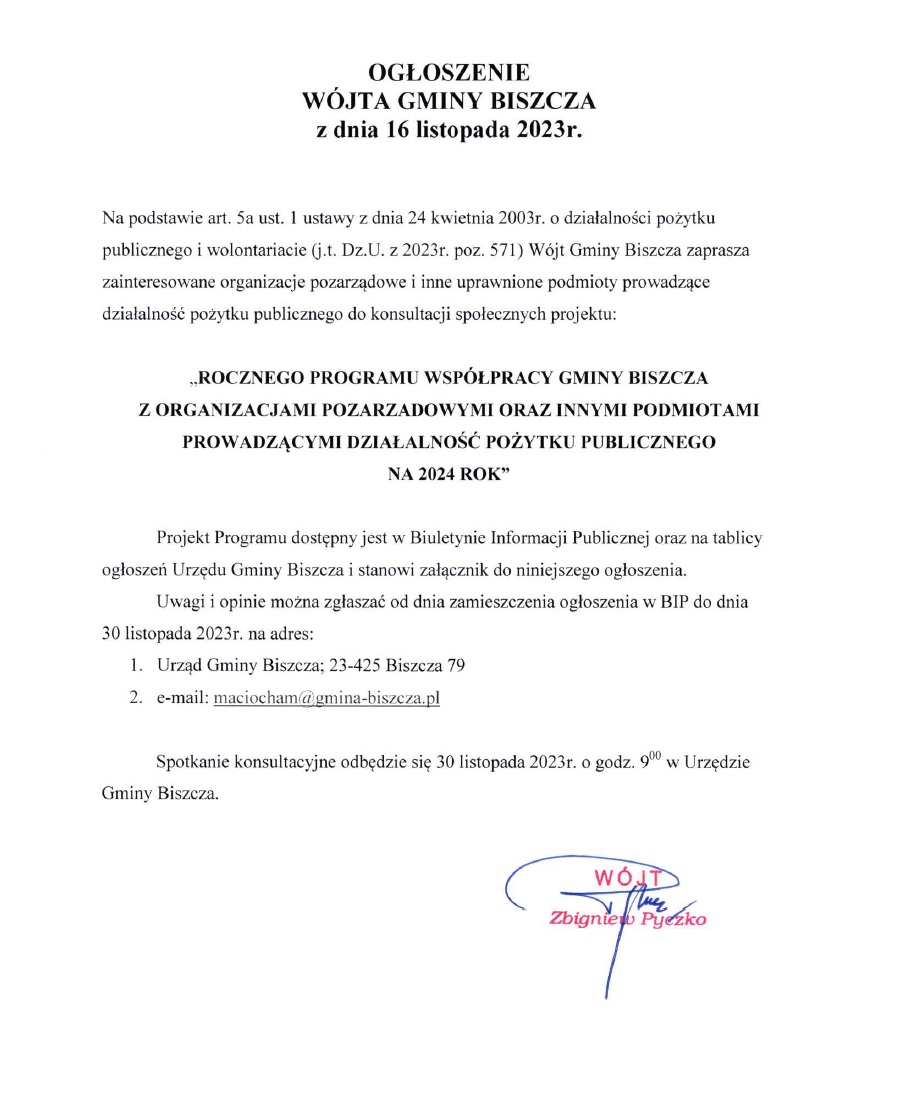 Zaproszenie na konsultacje społeczne. 2023-11-27 Do pobrania: 1. Ogłoszenie 2. roczny program współpracy 2024 projekt « powrót