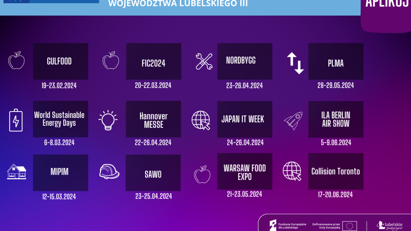 - Hannover MESSE (branża inżynierii mechanicznej, elektrycznej i cyfrowe oraz sektora energetycznego), Hanower/Niemcy, 22-26 kwietnia 2024 r.