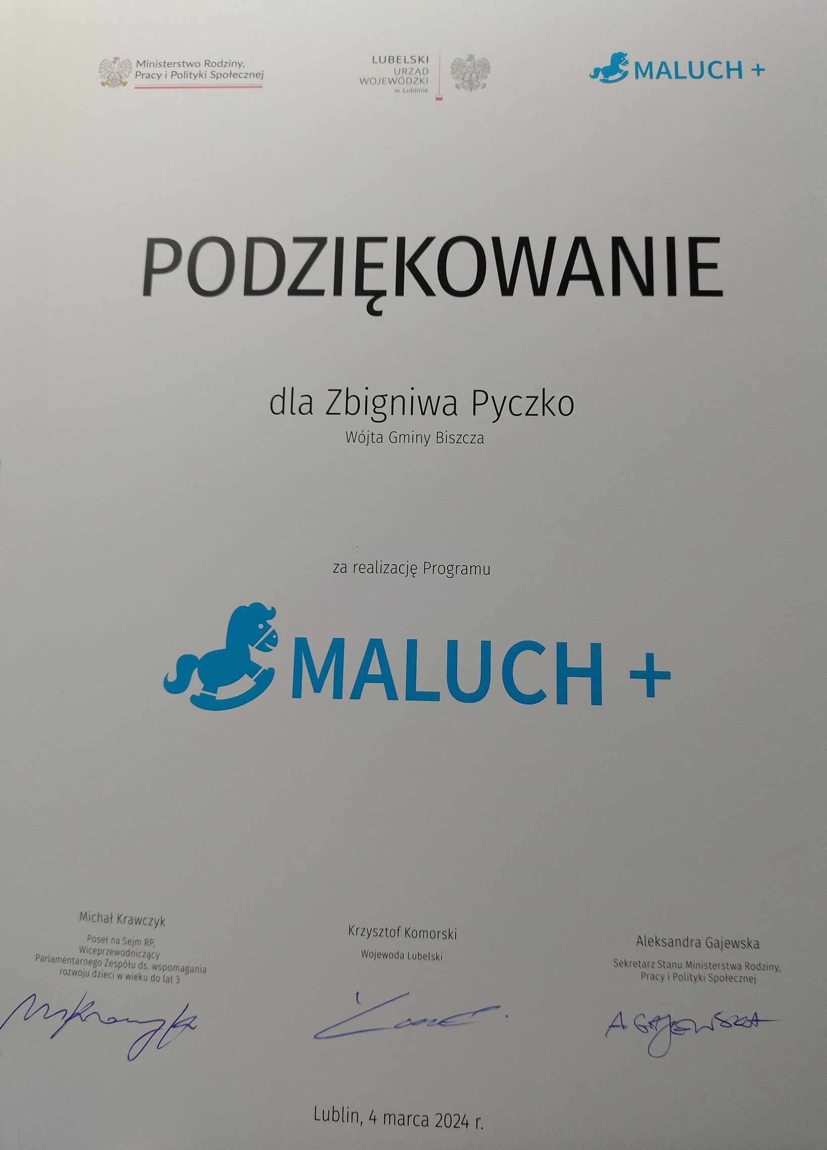 Za realizację Programu „Maluch+” przedstawiciele jednostek samorządu terytorialnego zostali uhonorowani podziękowaniami. W imieniu Wójta Gminy Biszcza Pana Zbigniewa Pyczko podziękowanie odebrała Kierownik Gminnego Zespołu ds. Oświaty w Biszczy Pani Jolanta Harasiuk.