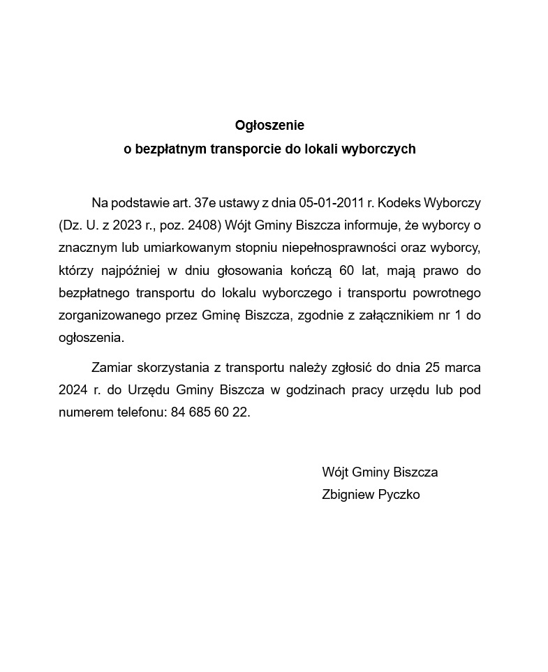 Ogłoszenie o bezpłatnym transporcie do lokali wyborczych 2024-03-18 Do pobrania: Załącznik_nr_1 « powrót