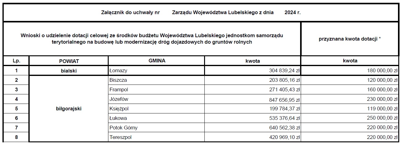 Gmina Biszcza otrzymała dofinansowanie z budżetu Województwa Lubelskiego ze środków na budowę i modernizację dróg dojazdowych do gruntów rolnych