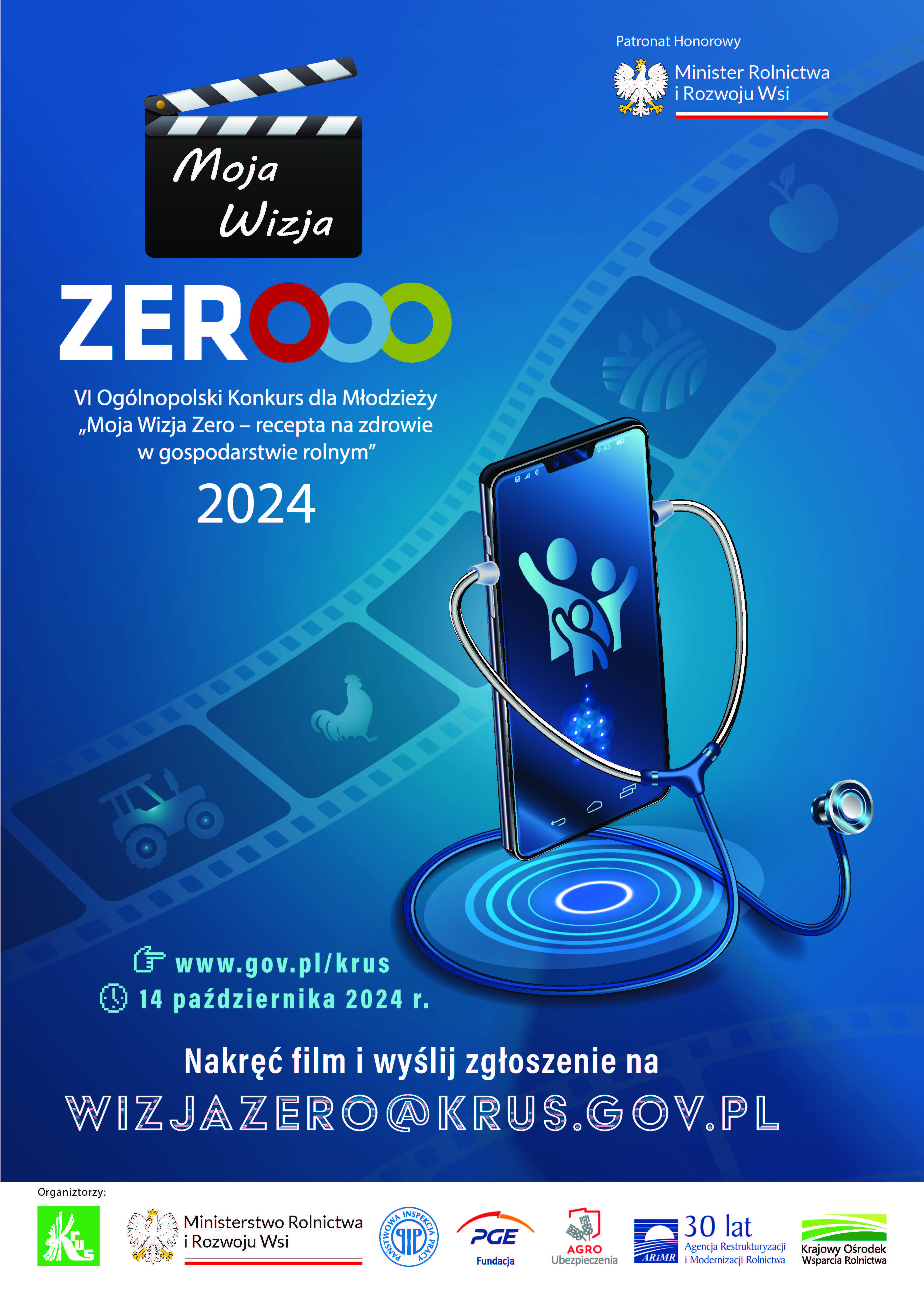 VI edycja Ogólnopolskiego Konkursu dla Młodzieży „Moja Wizja Zero – recepta na zdrowie w gospodarstwie rolnym” odbywa się pod Patronatem Honorowym Ministra Rolnictwa i Rozwoju Wsi. Współorganizatorami konkursu są: Ministerstwo Rolnictwa i Rozwoju Wsi, Agencja Restrukturyzacji i Modernizacji Rolnictwa, Krajowy Ośrodek Wsparcia Rolnictwa, Państwowa Inspekcja Pracy Główny Inspektorat Pracy, AGRO Ubezpieczenia - Towarzystwo Ubezpieczeń Wzajemnych, Fundacja PGE.
