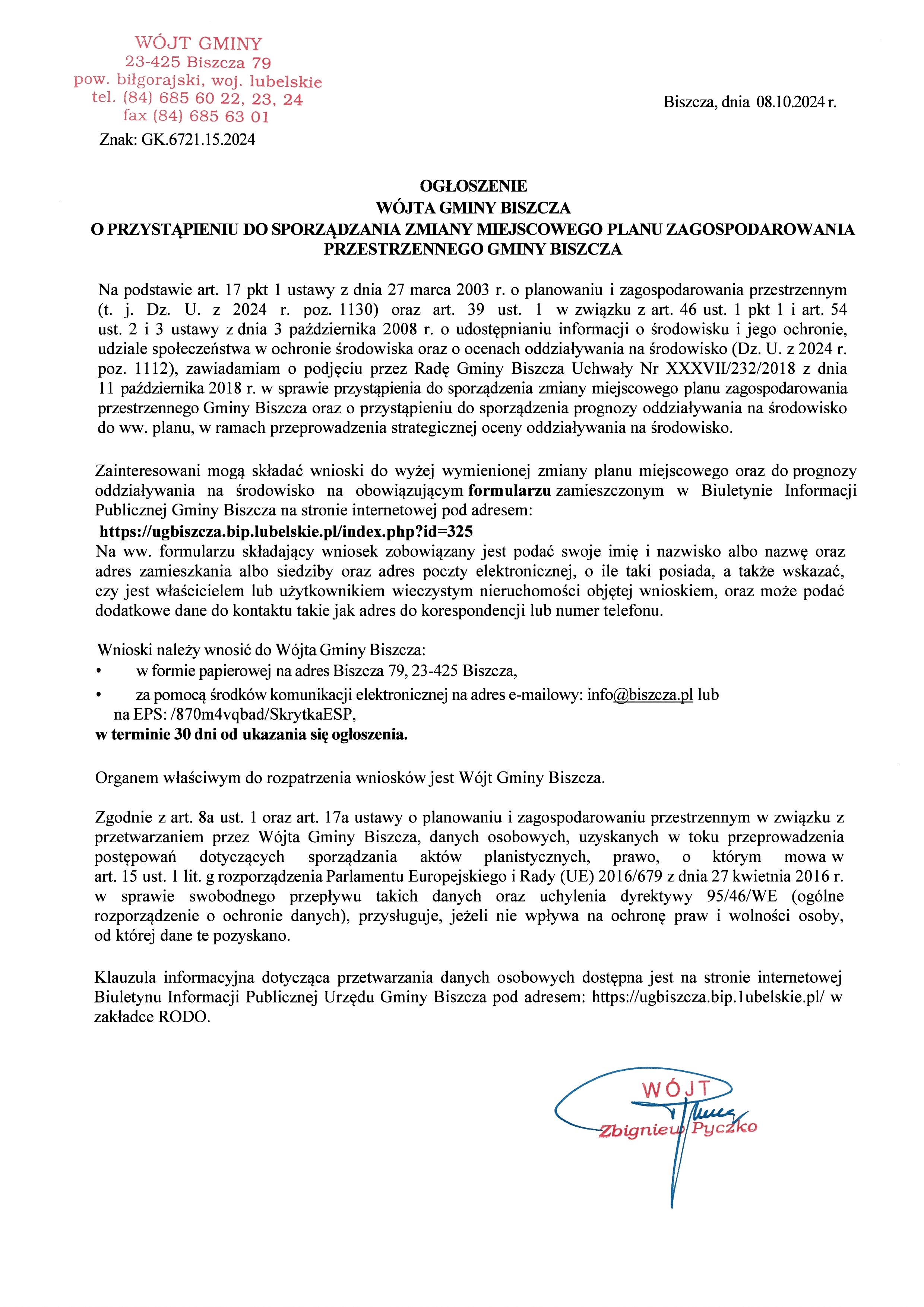 Ogłoszenie Wójta Gminy Biszcza o przystąpieniu do sporządzania zmiany miejscowego planu zagospodarowania przestrzennego Gminy Biszcza