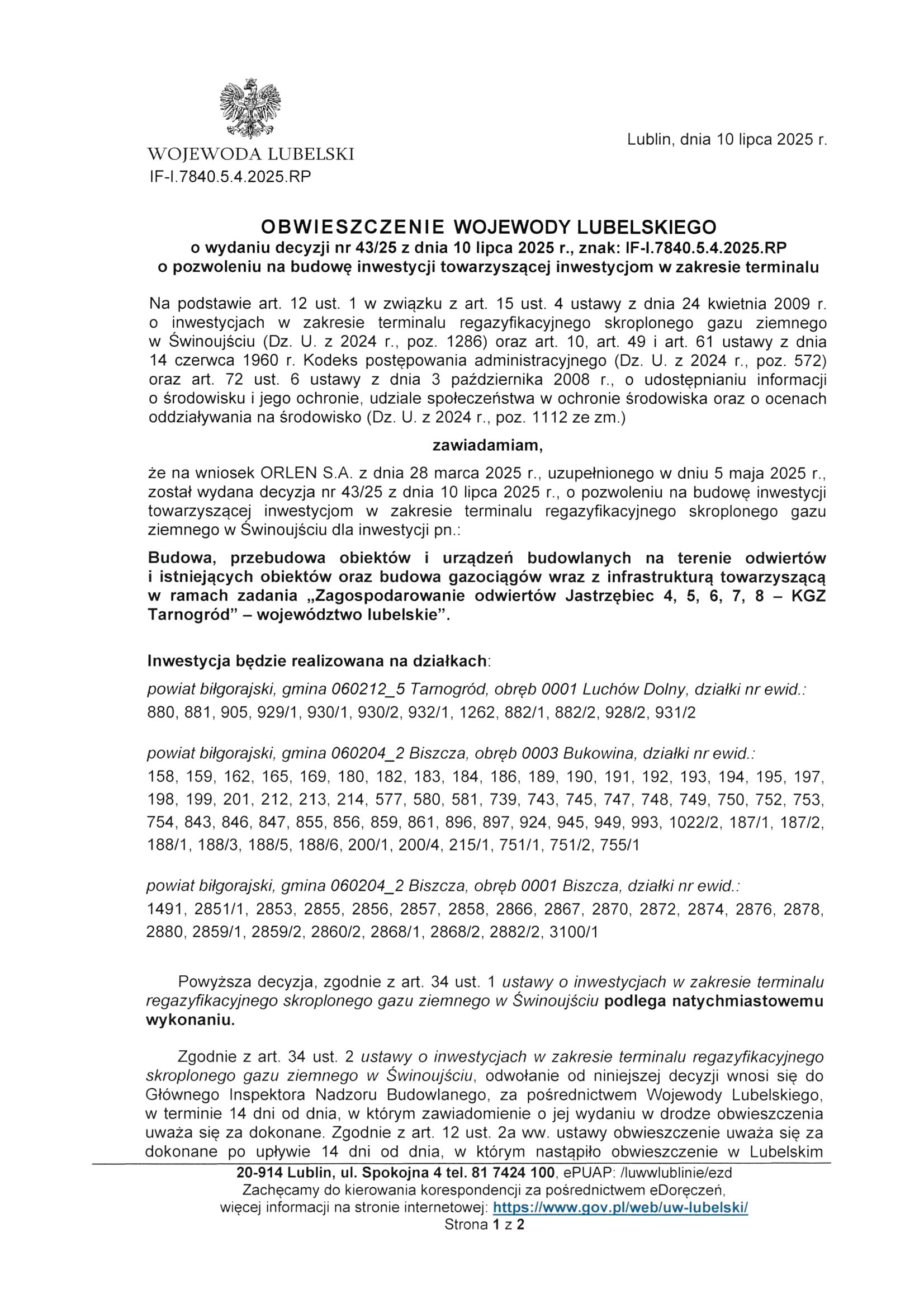 OBWIESZCZENIE WOJEWODY LUBELSKIEGO