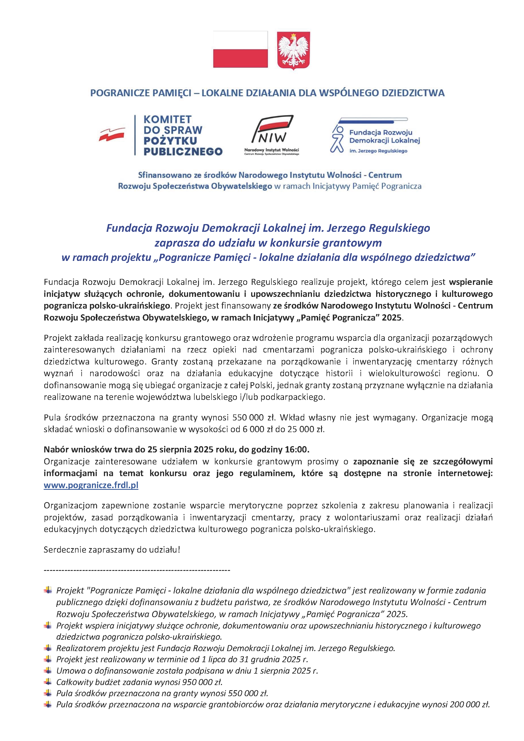 Więcej informacji na stronie: https://frdl.org.pl/aktualnosci/zapraszamy-do-skladania-wnioskow-w-konkursie-grantowym-w-ramach-inicjatywy-pamiec-pogranicza-2025