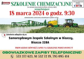 2024-03-08 Szkolenie chemizacyjne W dniu 18 marca 2024 o godz. 9:30 odbędzie się szkolenie chemiozacyjne w Samorządowym Zespole Szkolnym w Biszczy, Biszcza 228A PROWADZIMY RÓWNIEŻ ZAPISY NA SZKOLENIE PODSTAWOWE, OBOWIĄZKOWE ZAPISY TELEFONICZNE ® 533 377 623, 81 532 72 19, 795 095 414