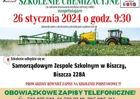 2024-01-19 Szkolenie chemizacyjne W dniu 26 stycznia 2024r o godzinie 9:30 w Samorządowym Zespole Szkolnym w Biszczy odbędzie się szkolenie chemizacyjne organizowane przez firmę SZKOLTEX Daniel Sochacki skierowane do rolników w zakresie stosowania środków ochrony roślin (szkolenie chemizacyjne), zaświadcze o ukończeniu szkolenia jest wydawane na 5 lat.