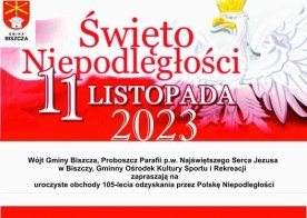 2023-10-31 NARODOWE ŚWIĘTO NIEPODLEGŁOŚCI Wójt Gminy Biszcza, Proboszcz Parafii p.w. Najświętszego Serca Jezusa w Biszczy oraz Gminny Ośrodek Kultury. Sportu i Rekreacji w Biszczy zapraszają na uroczyste obchody 105-lecia odzyskania przez Polskę Niepodległości. Program uroczystości: 8.30 - zbiórka delegacji wieńcowych i pocztów sztandarowych na placu przy GOKSiR i przemarsz do kościoła parafialnego. 9.00 - Msza Św. w kościele pw. Najświętszego Serca Jezusa w Biszczy. 10.00 - część artystyczna w wykonaniu zespołów z terenu Gminy Biszcza (w kościele parafialnym). 11.00 - złożenie wieńców pod Pomnikiem Poległych Legionistów. Serdecznie zapraszamy wszystkich, a szczególnie poczty sztandarowe i delegacje wieńcowe do wzięcia aktywnego udziału ww. uroczystości. Podczas uroczystości obowiązuje ceremoniał wojskowy.