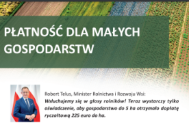 2023-08-12 Płatność dla małych gospodarstw zamiast płatności bezpośrednich Płatność dla małych gospodarstw zamiast płatności bezpośrednich – kto może skorzystać, jaka jest stawka, do kiedy i jak złożyć dokumenty. Zgodnie z wcześniejszymi zapowiedziami, wprowadzone zostało ułatwienie dla rolników, którzy posiadają małe gospodarstwa - o powierzchni do 5 ha - i złożyli wnioski o przyznanie płatności za 2023 rok. Chodzi o to, że w takiej sytuacji zamiast ubiegać się o przyznanie dopłat bezpośrednich do poszczególnych upraw na danej powierzchni, rolnik może wnioskować o przyznanie zryczałtowanej płatności do hektara. Jej wysokość wynosi 225 euro/ha.