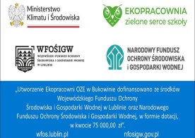 2023-08-24 Utworzenie Ekopracowni OZE w Bukowinie Szkoła Podstawowa im. Hetmana Jana Zamoyskiego w Bukowinie otrzymała dofinansowanie przedsięwzięcia pn „Utworzenie Ekopracowni OZE w Bukowinie” w ramach Konkursu „Ekopracownia-zielone serce szkoły” z Programu Regionalnego Wsparcia Edukacji Ekologicznej w kwocie 75.000,00 zł. Wartość całego zadania to kwota 83.400,00zł . Termin realizacji projektu - do 20 września 2023 r.