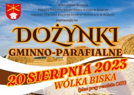 2023-08-03 Dożynki Gminno – Parafialne Wójt Gminy Biszcza Parafia Najświętszego Serca Jezusa w Biszczy Gminny Ośrodek Kultury Sportu i Rekreacji w Biszczy Zapraszają na Dożynki Gminno – Parafialne 20 sierpnia 2022r. Wólka Biska plac przy remizie OSP.