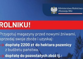 2023-05-05 POLSKA WIEŚ TO PRZYSZŁOŚĆ Rolniku przygotuj magazyny przed nowymi żniwami, sprzedaj swoje zboże i uzyskaj: dopłatę 2200 zł do hektara pszenicy z budżetu państwa, dopłatę do pozostałych zbóż tj.: kukurydzy, jęczmienia, pszenżyta, żyta, owsa, mieszanek zbożowych, gryki oraz dopłatę do: rzepaku, rzepiku. Dopłata będzie zróżnicowana w zależności od regionu i odległości od wschodniej granicy. Jeśli chcesz otrzymać dopłatę, to: sprzedaj swoje zboże do 15 czerwca br., weź fakturę VAT lub VAT RR za sprzedane zboże. Złóż wniosek w Biurze Powiatowym ARiMR w terminie 1-30 czerwca br. Po szczegółowe informacje zgłoś się do powiatowego oddziału ARiMR.