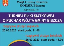 2023-03-03 Turniej piłki siatkowej o puchar Wójta Gminy Biszcza Wójt Gminy Biszcza oraz Dyrektor Gminnego Ośrodka Kultury, Sportu i Rekreacji w Biszczy zapraszają na "Turniej piłki siatkowej o puchar Wójta Gminy Biszcza", w dniach 25-26 marca 2023r. sala gimnastyczna w SZS im. Dzieci Zamojszczyzny w Biszczy.