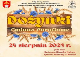 2025-08-22 Dożynki Gminno-Parafialne 2025 r. Wójt Gminy Biszcza, Parafia Najświętszego Serca Jezusa w Biszczy oraz Gminny Ośrodek Kultury, Sportu i Rekreacji w Biszczy zapraszają na Dożynki Gminno–Parafialne, które odbędą się 24 sierpnia 2025 r. na placu przy Gminnym Ośrodku Kultury, Sportu i Rekreacji w Biszczy. Przyjdźmy wspólnie podziękować za tegoroczne plony, cieszyć się tradycją i spędzić czas w radosnej atmosferze w gronie rodziny, sąsiadów i przyjaciół.