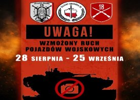 2025-09-08 Wzmożony ruch wojskowych kolumn - apel do kierowców! Od połowy sierpnia do końca września 2025 r. na drogach niemal całego kraju wystąpi wzmożony ruch pojazdów wojskowych w ramach federacji ćwiczeń „Żelazny Obrońca-25”. Ćwiczenia mają charakter defensywny i nie są skierowane przeciwko żadnemu państwu.