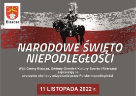 2022-11-03 NARODOWE ŚWIĘTO NIEPODLEGŁOŚCI Wójt Gminy Biszcza, Gminny Ośrodek Kultury Sportu i Rekreacji zapraszają na uroczyste obchody odzyskania przez Polskę niepodległości 11 listopada2022r. Serdecznie zapraszamy wszystkich, a szczególnie poczty sztandarowe i delegacje wieńcowe do wzięcia aktywnego udziału ww. uroczystości