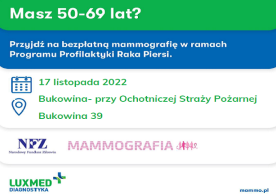 2022-11-09 Program Profilaktyki Raka Piersi. Masz 50-69 lat przyjdź na bezpłatną mammografię w ramach Programu Profilaktyki Raka Piersi. 17 listopada 2022, Bukowina- przy Ochotniczej Straży Pożarnej Bukowina 39