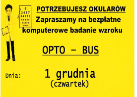 2022-11-10 Bezpłatne komputerowe badanie wzroku OPTO – BUS Potrzebujesz okularów, zapraszamy na bezpłatne komputerowe badanie wzroku OPTO – BUS Dnia: 1 grudnia (czwartek) Biszcza parking przy Kościele w godz.: 14.00-15.30 OBOWIĄZUJĄ zapisy pod numerem 690 070 902