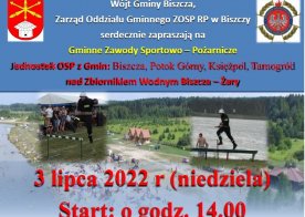 2022-06-24 Zawody sportowo – pożarnicze z terenu Gmin: Biszcza, Potok Górny, Księżpol, Tarnogród Wójt Gminy Biszcza, Komendant Powiatowy Państwowej Straży Pożarnej w Biłgoraju, Zarząd Oddziału Gminnego ZOSP RP w Biszczy, Ochotnicza Straż Pożarna w Bukowinie Serdecznie zapraszają na Zawody sportowo – pożarnicze z terenu Gmin: Biszcza, Potok Górny, Księżpol, Tarnogród które odbędą się 3 lipca 2022 roku o godz. 14.00 nad Zbiornikiem Wodnym Biszcza – Żary.
