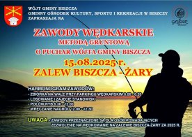2025-08-14 Zawody Wędkarskie o Puchar Wójta Gminy Biszcza Wójt Gminy Biszcza oraz Gminny Ośrodek Kultury, Sportu i Rekreacji w Biszczy zapraszają na Zawody Wędkarskie metodą gruntową, które odbędą się 15 sierpnia 2025 r. nad Zalewem Biszcza-Żary. Ważne! Udział w zawodach mogą wziąć wyłącznie osoby posiadające zezwolenie na wędkowanie na Zalewie Biszcza-Żary za 2025 rok.
