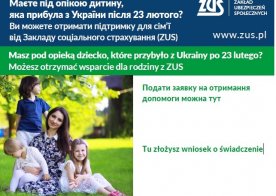 2022-03-24 Masz pod opieką dziecko, które przybyło z Ukrainy po 23 lutego? Możesz otrzymać wsparcie dla rodziny z ZUS Tu złożysz wniosek o świadczenie. Подати заявку на отримання допомоги можна тут. Pomogą Ci pracownicy ZUS. Вам допоможуть працівники Закладу соціального страхування (ZUS)