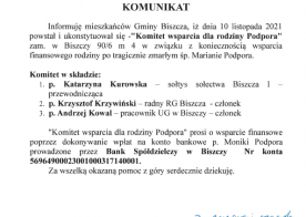 2021-11-10 KOMUNIKAT Informuję mieszkańców Gminy Biszcza, iż dnia 10 listopada 2021 powstał i ukonstytuował się -"Komitet wsparcia dla rodziny Podpora" zam. w Biszczy 90/6 m 4 w związku z koniecznością wsparcia finansowego rodziny po tragicznie zmarłym śp. Marianie Podpora.