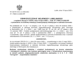 2025-07-18 OBWIESZCZENIE WOJEWODY LUBELSKIEGO Obwieszczenie Wojewody Lubelskiego o wydaniu decyzji nr 43/25 z dnia 10 lipca 2025 r., znak: IF-1.7840.5.4.2025.RP o pozwoleniu na budowę inwestycji towarzyszącej inwestycjom w zakresie terminalu regazyfikacyjnego skroplonego gazu ziemnego w Świnoujściu dla inwestycji pn.: Budowa, przebudowa obiektów i urządzeń budowlanych na terenie odwiertów i istniejących obiektów oraz budowa gazociągów wraz z infrastrukturą towarzyszącą w ramach zadania „Zagospodarowanie odwiertów Jastrzębiec 4, 5, 6, 7, 8 - KGZ Tarnogród" - województwo lubelskie".