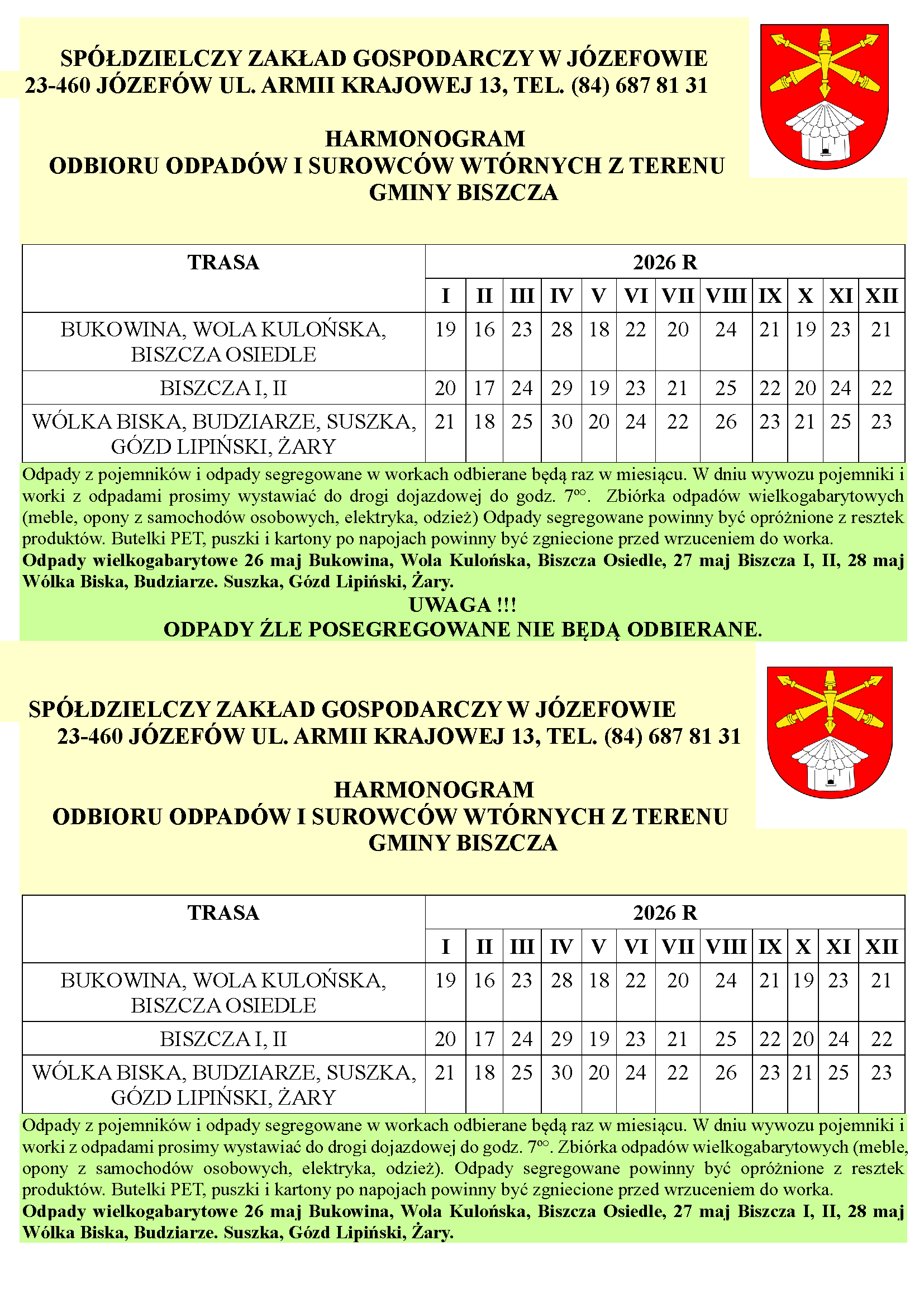 Harmonogram odbioru odpadów 2026