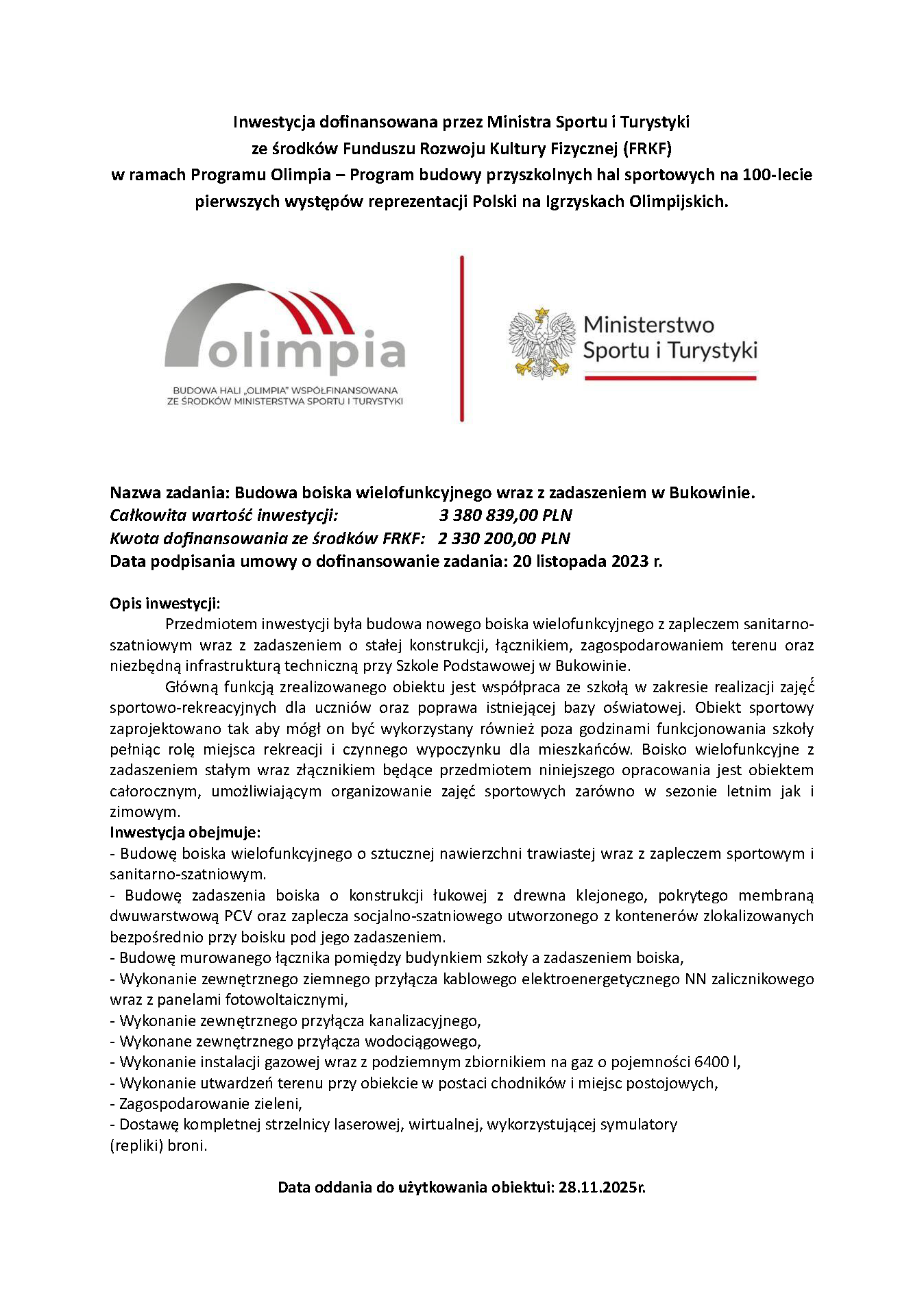 Budowa boiska wielofunkcyjnego wraz z zadaszeniem w Bukowinie.